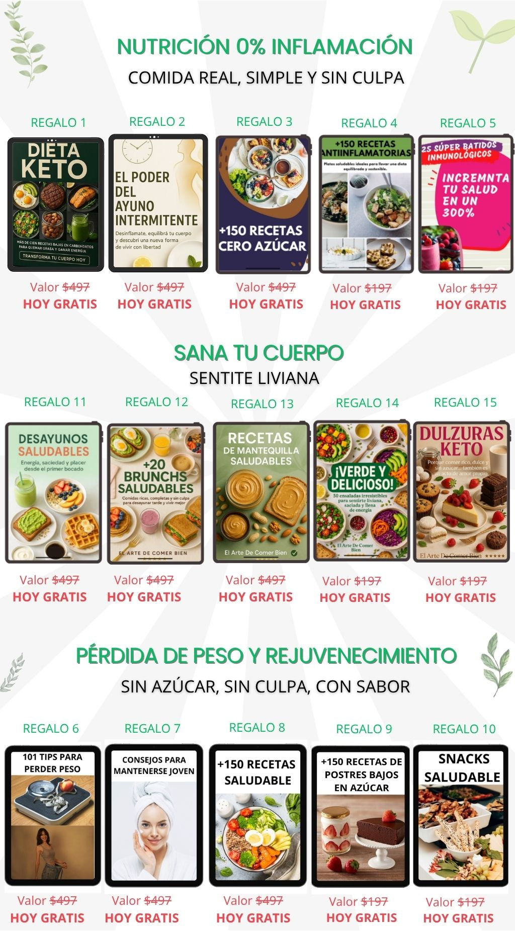 Además, incluye 8 bonos exclusivos (desde snacks hasta desayunos exprés) que te mantienen motivada y sin excusas.